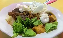 Tahu campur, literally meaning "mixed tofu" in Javanese language and broader Indonesian language, is an East Javanese tofu dish. The dish consists of sliced tahu goreng (fried tofu), lontong (rice cakes), lentho (fried black-eyed pea patty) or sometimes replaced by perkedel (potato or cassava patty cakes), fresh bean sprouts, fresh lettuce, yellow noodles, and krupuk crackers, served in savoury beef stew, garnished with fried onions, and sambal chili sauce.[1] The beef stew soup is seasoned with spices and petis, a type of shrimp paste commonly used in East Javanese cuisine.[2]