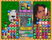 The Gameplay is similar to Puyo Puyo. The player must beat the opponent by creating combos, which involve matching three balls or more of the same color simultaneously. Doing so will fill the opponent's side with colored blocks from either the top or bottom. The blocks contain a certain ball color, depending on the color of the block. When blocks are matched, the color ball is released. The side that exceeds the top first loses. Score is also added for both sides, but the opponent's score doesn't affect the rounds in any way.