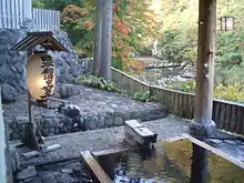 Takanoyu Onsen has its own hot spring, which emerges on the east bank of the Yakunai River. The water temperature at the spring source is 72 °C (162 °F). Only about ten percent of all hot spring facilities in Japan have water flowing directly from their own pure source.[4] Its medicinal benefits are recommended for neuralgia, rheumatism, and skin disorders.[5]