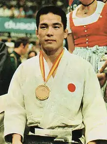 Kawaguchi began training in judo at age 5 under his father, who was a local judo coach.[1] He later won an inter-highschool judo tournament, and in 1969 entered Meiji University.[1] In 1971 he defeated the future Olympic gold medalist Toyokazu Nomura in the world championship final, and became the Japanese representative for the -63 kg division at the 1972 Summer Olympics.[2] After two quick victories in the first and second rounds of the Olympic competition, Kawaguchi faced Mongolian judoka Bakhvain Buyadaa in the third round, and broke two ribs while escaping from Buidaa's ground pin.[2] Coach Akio Kaminaga suggested Kawaguchi to withdraw, but Kawaguchi continued, and advanced to the semifinal with a close decision victory. He won the semifinal against Kim Yong-Ik of North Korea with a yoko-shiho-gatame, only to face Buidaa in the final. In contrast to their previous bout, Kawaguchi quickly pinned Buidaa with a kouchi gari, and won with a kami-shiho-gatame within 39 seconds. Buidaa was later disqualified for failing a drug test.[3]