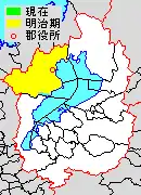 Map of Takashima District with Meiji period (1890) area in yellow.