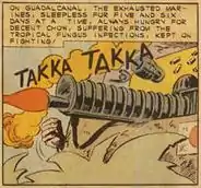 Lichtenstein was a trained United States Army pilot, draftsman and artist as well as a World War II (WWII) veteran who never saw active combat.[3][4] The work depicts a machine gun firing as it is situated above the camouflage of palm fronds during the Battle of Guadalcanal. The image shows shell casings and a grenade in mid flight. An explosion is stylized with the titular phrase.[2] The source of Takka Takka is the comic book Battlefield Action #40 (February 1962, Charlton Comics Group).[5]