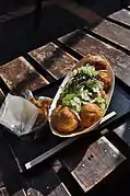 Takoyaki (たこ焼き or 蛸焼) is a ball-shaped Japanese snack made of a wheat flour-based batter and cooked in a special molded pan. It is typically filled with minced or diced octopus (tako), tempura scraps (tenkasu), pickled ginger (beni shoga), and green onion (negi).[1][2] The balls are brushed with takoyaki sauce (similar to Worcestershire sauce) and mayonnaise, and then sprinkled with green laver (aonori) and shavings of dried bonito (katsuobushi).
