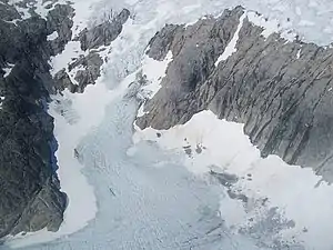 The glacier, which converges with the Taku River at Taku Inlet, has a history of advancing until it blocks the river, creating a lake, followed by a dramatic break of the ice dam. The most recent of these advances occurred in 1750. The glacier has advanced 7.75 kilometres (4.82 mi) since 1890, and as of June 29, 2012 is 1.26 kilometres (0.78 mi) from Taku Point.[3] It is the only advancing glacier of the 20 major glaciers of the Juneau Icefield.[4] If the advance continues it will again block the river, but this appears unlikely at present. Since 1946, the glacier has been monitored by the Juneau Icefield Research Program, which has documented its rate of advance since 1988 at 17 metres (56 ft) a year. The advance is due to a positive mass balance; that is, more snow accumulates than snow and ice melt. Until 1948 the glacier had a calving front; since then the terminus has been grounded.[5]