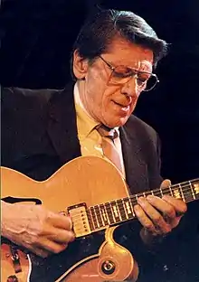 Talmage Holt Farlow (June 7, 1921[2] – July 25, 1998)[3] was an American jazz guitarist. He was nicknamed "Octopus" because of how his large, quick hands spread over the fretboard. As Steve Rochinski notes, "Of all the guitarists to emerge in the first generation after Charlie Christian, Tal Farlow, more than any other, has been able to move beyond the rhythmic, melodic, and harmonic vocabulary associated with the early electric guitar master. Tal's incredible speed, long, weaving lines, rhythmic excitement, highly developed harmonic sense, and enormous reach (both physical and musical) have enabled him to create a style that clearly stands apart from the rest."[4] Where guitarists of his day combined rhythmic chords with linear melodies, Farlow placed single notes together in clusters, varying between harmonically enriched tones. As music critic Stuart Nicholson put it, "In terms of guitar prowess, it was the equivalent of Roger Bannister breaking the four-minute mile."[5]