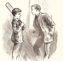 Reed's first response to the request for school stories for The Boy's Own Paper was The Adventures of a Three-Guinea Watch, which ran for 19 instalments from October 1880 to April 1881. The travels of a schoolboy's pocket watch are charted through school, university and, finally, India at the time of the Indian Rebellion of 1857.[34] The school, "Randlebury", is believed to be based, like "Parkhurst", on information Reed received from friends who had boarded at Radley.[35] The success of the story encouraged the B.O.P.'s editors to ask Reed to attempt a longer and more ambitious work. The result was The Fifth Form at St. Dominic's, which became the favourite and most influential of all Reed's stories.[36] Extended over 38 episodes, each a self-contained unit within an overall plot, this was the first of a sequence of school stories, all serialised in the B.O.P. The boarding school milieu was repeated, with a few variations, in The Willoughby Captains (serialised 1883–84), The Master of the Shell (1887–88), The Cock-House at Fellsgarth (1891)[n 4] and Tom, Dick and Harry (1892–93). Reed followed the suggestion of his editors by setting My Friend Smith (1882–83) in a different kind of school, a "modest establishment for the backward and troublesome".[37] It was, however, the boarding school stories that endured and which became the standard model for school stories for many decades.[38] All the serials were quickly issued in book form, and most were reprinted for the benefit of successive generations of boys, up to the 1950s.[4] The model was imitated or copied by other writers for the next half century; according to historian Isabel Quigly, "Reed was a better writer than his followers, and has been diminished by their imitations."[39]