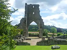 The monastery, which was founded by Rhys ap Gruffydd in or about 1185, is in the care of Cadw. In common with Strata Florida Abbey, it was once claimed to be the site of the grave of the medieval Welsh poet Dafydd ap Gwilym, but this is one of the discredited theories of Iolo Morganwg. There are two lakes near the abbey ruins, which was used for fish farming to support the community of monks. The abbey was dissolved by Henry VIII and the structure mined by the villagers for stone to build much of the present village and the chapel next to the abbey.[1] The ruinous tower is surrounded by steep wooded hills, and it can be reached by a circuitous lane from the main road. It is well signposted.