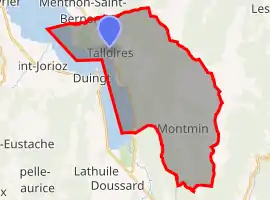Talloires-Montmin (French pronunciation: [talwaʁ mɔ̃mɛ̃]) is a commune in the Haute-Savoie department in the Auvergne-Rhône-Alpes region in Eastern France. In 2018, it had a population of 1,971. It was established on 1 January 2016 following the fusion of the former communes of Talloires and Montmin.[2]
