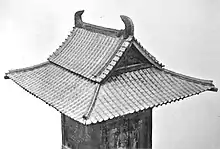The miniature building has been identified variously as a palace-style building[2] and as a temple "golden hall" or kondō.[9] It has a hip-and-gable roof in the style known as irimoya-zukuri, or more precisely a variant of the type, known as shikorobuki (錏葺). In this technique, the hip and gable are clearly distinguished, with the latter overhanging the notably flat former and there is a distinct break in the tiling.[16][12] When Shitennō-ji was rebuilt after its destruction in the Pacific War, the roofing of the kondō retained this ancient style.[16][17] Ornamenting both ends of the ridgepole that runs the length of the top of the roof are curved tiles known as shibi, found in surviving eighth-century architecture only on the Tōshōdai-ji kondō.[9][18] The roof tiles are of the lipless, semi-circular type.[2][19] In the triangular field at each gable end is a "king-post", supporting the end of the ridgepole.[13][20] Descending the length of the gable and perpendicular to the main ridgepole are kudarimune (降り棟, or descending ridges).[16][21] Edging the gable beyond the descending ridges are "hanging tiles" or kakegawara (掛瓦), laid at right angles to both the other tiles and the descending ridges and projecting slightly to afford a degree of shelter (were this building not a miniature) to the bargeboards that help define the gable.[16][22]