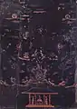 Paintings on Buddhist themes cover all four sides of both building and plinth. While both pigmented and incised images are known from a number of tombs of a similar date, the shrine is the only example of Buddhist painting from early seventh-century Japan.[9][28] The closest domestic pictorial parallel is with embroideries such as the Tenjukoku Mandala from neighbouring Chūgū-ji, which shows Sui and Korean influence.[2][29] The description below can be followed in the linked images.