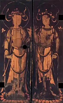 Standing on the front doors of the miniature building are two of the Four Guardian Kings, clad in armour, with flowing draperies, holding slender halberds; their heads are ringed with aureolae or Buddhist haloes.[2] On the side doors are bodhisattvas standing on lotus pedestals, their heads crowned with three mani jewels, holding a flowering lotus stalk in one hand and forming a mudrā or ritual gesture with the other.[2] The mudrā is a variant of the aniin (安慰印) or seppōin (説法印), the palm turned in and the thumb and index finger forming a circle (see Wheel of the Law), which according to the Sutra of the Eight Great Bodhisattvas symbolizes their thought of consoling all sentient beings.[30] The side panels flanking the doors are adorned with flowers and jewels.[2] On the back panel is a sacred landscape, with four caves in which Buddhist monks are seated, its heights topped with three pagodas.[2] Either side of the central mountain is a phoenix and apsara or tennin (celestial being), riding on clouds. At the top are the sun and the moon. This may be a representation of Mount Ryoju, where Shaka preached the Lotus Sutra.[2]