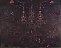The shrine is made of lacquered hinoki or Japanese cypress and camphor wood.[1] Both are native species.[9] Attached to the members of the building and the edges of plinth and dais are bands of openwork bronze. It was under this metalwork that the tamamushi wings were applied in the technique known as beetlewing.[2] The tamamushi beetle, a species of jewel beetle, is also native to Japan. The Thousand Buddhas are of repoussé or hammered bronze and the roof tiles are also of metal.[7] Optical microscopy or instrumental analysis, ideally non-invasive, would be needed to identify conclusively the pigments and binder used in the original colour scheme - red, green, yellow, and white on a black ground.[35] The range of available pigments, compared with that evident in the early decorated tumuli, was transformed with the introduction of Buddhism to Japan.[36][37] The precise medium in which the pigments are bound is uncertain.[35] While commonly referred to as lacquer, since the Meiji period some scholars have argued instead that the paintings employ the technique known as mitsuda-e, an early type of oil painting, using perilla (shiso) oil with litharge as a desiccant.[35][38]