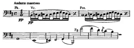 In the prologue of the symphonic poem the theme of the majestic Caucasian landscape sounds: gloomy sounds of low strings against the background of continuous murmur of kettledrums - in the gorge of Daryal Terek valley roaring menacingly. Then appears the love call of the Tsarina Tamara presented by the English horn later repeated by the oboe, which brings the traveler to the mysterious castle. The main part of the poem - Allegro moderato ma agitato - begins with passionate theme of the viola section; then the music is based on the rhythms of oriental Turkish-Iranian melodies, which leads the listener to the orgy scene, where the themes of Caucasian dances are heard. The painting full of passion ends with an epilogue - Andante - with music similar to the introduction.