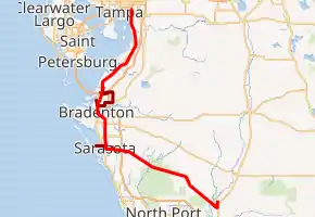 South of Palmetto, the tracks crossed the Manatee River on a bascule bridge into Bradenton, with Bradenton's passenger depot (which still stands today and serves as a medical clinic[14]) built just south of the bridge. The tracks then turned southeast for a short distance and crossed the SAL's track before turning south again and into Sarasota near Fruitville.