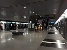 Both of these shapes reflect the dimensions of the station and "gave polarities" to the nearly symmetrical station,[46] bringing a sense of "calm and order" to the station atmosphere.[47][48] The shapes was also meant to "fill the void" between the vastness of space and commuters.[46] These shapes, enhanced by the reflecting benches on the platforms,[47] act as wayfinders for passengers travelling around the station.[48]