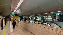 Like most EWL elevated stations on the eastern segment on the line (after Kallang MRT station eastbound except for Eunos MRT station), Tampines station has the notable feature of the dome-shaped roof, segmented like a caterpillar, over the platform level. The design was an attempt by the MRT Corporation (MRTC) to give the stations on the EWL an "attractive look".[43] The colour scheme used for the station is rustic brown, reflected on the doors to the restricted areas and the ceiling trunking box at the platform level of the station.[44]
