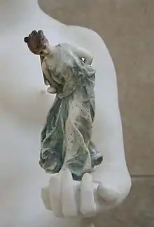 "Inspired by his characteristic desire for both archaeological accuracy and realism, Gérôme delicately tinted the skin, hair, lips, and nipples of his Tanagra, causing a sensation at the Salon of 1890."[4] A contemporary critic suggested that if the sculpture had been "secretly buried for a time, and then publicly excavated as an antique, perhaps with a broken arm, it would have turned the heads of the whole art world, and been declared in its vital characteristics and subtle anatomy a rival to the Milo Venus."[5]