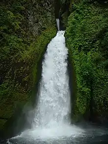 The most notable feature of the creek is Wahclella Falls, a 350 feet (110 m) waterfall around 1.5 miles (2.4 km) from the mouth of the creek. The falls are a popular recreation destination, with the Wahclella Falls Trail #436 running for 2.4 miles along the creek from the Historic Columbia River Highway State Trail to the falls. [2]