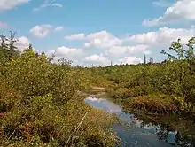 The Tannersville Cranberry Bog or Cranberry Swamp is a sphagnum bog on the Cranberry Creek in Tannersville, Pennsylvania. It is the southernmost boreal bog east of the Mississippi River, containing many black spruce and tamarack trees at the southern limit of their ranges. Technically, it can be classed as an acid fen, as it receives some groundwater flow. The site was designated a National Natural Landmark in December 1974.[1] It was purchased by The Nature Conservancy and the Conservation and Research Foundation[2] in 1957. Like many bogs, its terrain presents an image of solidity, but a liquid mass of decaying peat lies beneath a six-inch (152 mm) layer of sphagnum and a network of supporting tree roots. However, this bog may be viewed from a floating walkway.