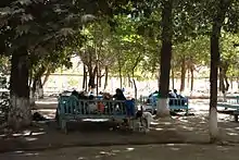 A Tapchan (топчан) is a type of outdoor furniture unique to Central Asia especially Tajikistan and Uzbekistan,[1] combining a large bed capable of holding 4-8 adults with a table at which meals can be eaten.[2]