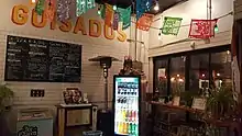 The menu includes more than 20 taco options as well as adobada, barbacoa, chile rellenos, guisados, tinga, and house-made tortillas.[5][2] Drink options include beer, cocktails, margaritas, agua fresca, and Jarritos.[3]