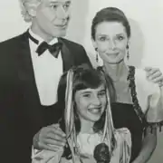 Tara McDonald, Audrey Hepburn and Paul Van Vliet at the 1st Danny Kaye Award, after winning the competition for England. (Maastricht, Holland)
