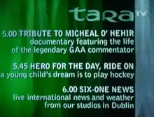 Tara Television had an exclusive option to purchase the majority of RTÉ's programming, and this accounted for about 80% of the total programmes broadcast by the station, with the remainder being filled by programmes purchased from other networks. It mainly broadcast news bulletins and current affairs programming, as well as extensive coverage of Irish sport, in particular, GAA. RTÉ made sure that from 16 July 2001, Tara Television was blocked to Irish Sky subscribers as they feared loss of advertising revenue.[1]