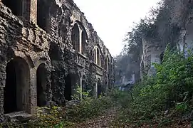 It resembles a rhombus with each side 240 metres (790 ft) long and up to 6 meters high.[1] It has 7 underground levels with a series of tunnels, kitchen accommodation, laundry, church, morgue, phone lines, 3 waterwells, and sewages. It also had small warehouses for gunpowder and medical rooms. There are also a range of military accommodations and fortifications both for troops and artillery. The rear side has a deep ditch which in emergency event could have been crossed by a retracting bridge built in 1893.[1] The fortress could accommodate up to 800 people.[1] The entrance was located on the east and south sides.
