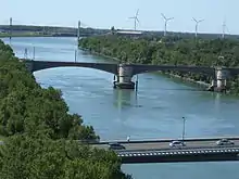 Tarascon is located 23 km (14 mi) south of Avignon and 20 km (12 mi) north of Arles, on the left (east) bank of the river Rhône. On the other side is the similarly sized town of Beaucaire in the département of Gard, région of Languedoc-Roussillon. Directly opposite each other and connected by several bridges, Beaucaire and Tarascon effectively constitute one town, with about 30,000 inhabitants. An irrigation canal of 18,00 km length rejoins the Rhone near Tarascon.