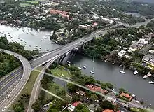 The Tarban Creek Bridge is a prestressed concrete arch bridge that carries the Burns Bay Road across the Tarban Creek, located west of the Sydney central business district in New South Wales, Australia. The bridge is situated between the Gladesville Bridge and the Fig Tree Bridge, being immediately to the north of Gladesville Bridge. The bridge connects the suburbs of Hunters Hill and Huntleys Point. In addition to the four-lane carriage, the bridge carries a grade-separated shared pedestrian footpath and cycleway.[2]