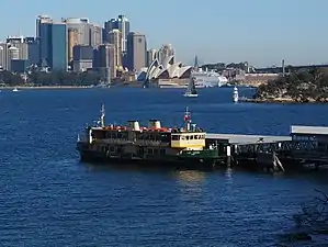 Taronga Zoo wharf is served by Sydney Ferries Taronga Zoo services operated by First Fleet and Emerald class ferries.[1] It is also served by Captain Cook Cruises services to Darling Harbour.[2]