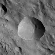 Tarpeia is a crater on the asteroid 4 Vesta located at 69.5°S and 29°E,[1] within the ridged and grooved terrain of Vesta's southern hemisphere.[2] It has a diameter of 41 km.[3] It is irregularly shaped and has a sharp, fresh rim.[2] It contains many small craters less than a kilometer across[2] and its steep slopes shows brilliant layers of minerals.[4]