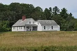 The Tarr–Eaton House stands in Harpswell Center, on the west side of Harpswell Neck Road (Maine State Route 123), in a field just north of the 1750 Harpswell Meetinghouse, a National Historic Landmark. It is a single-story wood frame structure, with a side gable roof, a reproduction central chimney, five-bay facade, clapboarded exterior, and a foundation of concrete and rubblestone. A single-story shed-roof ell extends northward from its rear northeast corner. The main facade faces south, consisting of four windows with simple surrounds, two on either side of the main entrance, which is topped by a four-light transom window. A porch extends across the eastern facade, supported by simple square posts. The interior has a typical center-chimney plan, with the entry vestibule housing a narrow winding staircase, with parlor spaces to either side, and the kitchen behind. Fireplaces feature Federal period mantels, and the interior retains other period finishes.[2]