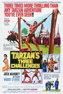 Tarzan's Three Challenges is a 1963 British-American adventure film filmed in Metrocolor. It is a follow-up to 1962's Tarzan Goes to India. The film was Jock Mahoney's second and final turn as the apeman, was produced by Sy Weintraub, written by Robert Day and Berne Giler, and directed by Robert Day.[3] The film was released in June 1963.