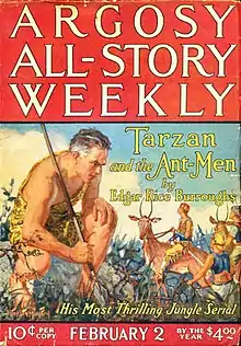Tarzan and the Ant Men is a novel by American writer Edgar Rice Burroughs, the tenth in his series of twenty-four books about the jungle hero Tarzan. It was first published as a seven-part serial in the magazine Argosy All-Story Weekly for February 2, 9, 16 and 23 and March 1, 8 and 15, 1924. It was first published in book form in hardcover by A. C. McClurg in September 1924. The story was also adapted for Gold Key Comics in Tarzan #174-175 (1968).