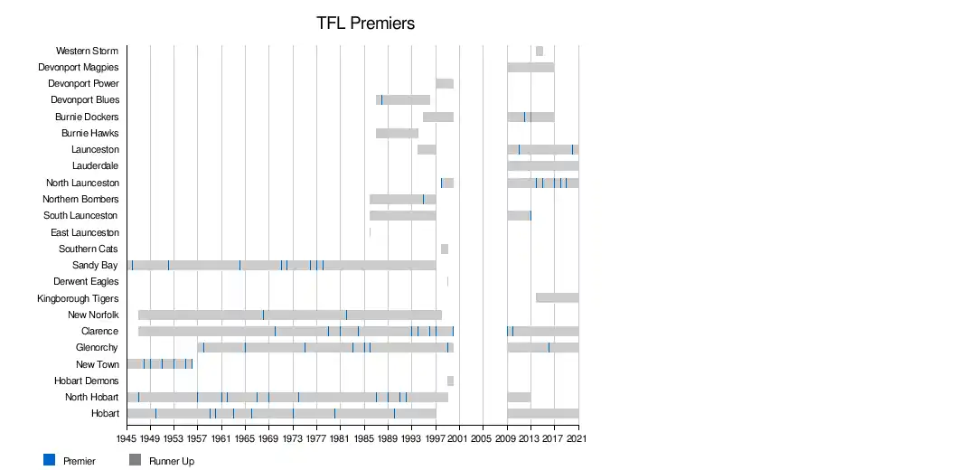 | Launceston | Blues | Riverside | Windsor Park | 1994 | 2011, 2020, 2021 | 3 | |