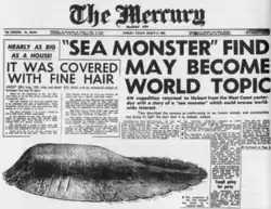 The Tasmanian Globster was a large unidentified carcass that washed ashore 2 miles (3.2 kilometres) north of Interview River in western Tasmania, in August 1960. It measured 20 ft (6.1 m) by 18 ft (5.5 m) and was estimated to weigh between 5 and 10 tons. The mass lacked eyes and in place of a mouth, had "soft, tusk-like protuberances". It had a spine, six soft, fleshy 'arms' and stiff, white bristles covering its body.