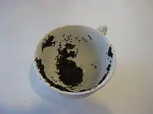An example of a tea leaf reading, showing what may be interpreted as a dog and a bird on the side of the cup.