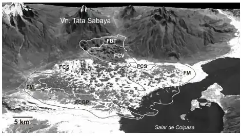The basement of the volcano is formed by the ignimbritic Altos de Pica formation, although outcrops of granite have been observed in the region;[15] one of these outcrops may be a Precambrian granite subsequently thermally modified in the Toarcian.[17] This basement is covered by younger volcanic rocks, alluvium and sediments of the Salar de Coipasa. Seismic tomography suggests that molten magma exists in the regional crust.[15]