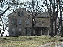 The sandstone house was built in 1863 to 1867 on the site of Tauy Jones' 1843 log trading post and hotel which was destroyed by pro-slavery arsonists in 1856 who were attempting to kill Jones.[3] The stone was quarried near Fort Scott, Kansas and transported by wagon. John Brown often stayed nearby in the grove on the other side of the creek. There were unverified legends that the house was a stop on the Underground Railroad and that Abraham Lincoln slept at the house, however, it is verified Horace Greeley did visit the Jones family.[4]