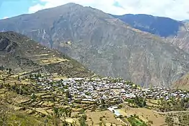![]() Tawlli Urqu (in the background on the right) as seen from Sarhua | |