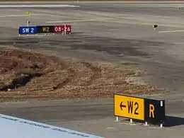 - Runway signs – White text on a red background. These signs identify a runway intersection ahead, e.g. runway 12-30 in the photo above.