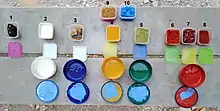 The red paint, at the bottom right of the image, is obtained by a mixture of paprika, pomegranate leaves, poppy powder and pomegranate peel. The preparation of these natural pigments consists of grinding, traditionally with a mortar and pestle. As for the names of colors, m’allems (craftsmen) had their own jargon. They used several names for each color depending on its degree, for example: "qalb lbanana", which means "banana heart", was used to denote light yellow, and "zraq Ellīl", which means "blue of the night ", was used to denote dark blue. The color obtained from the mixture of two colors was called "Mūssekh" which means dirty (because it is not a single pure color).[1]
