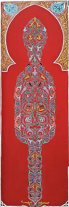 The zawwaqa (or artisan painters) have an astonishing ability to trace geometric or floral patterns. They know the secrets of "Ḥasba" and "Qasma"; fundamental rules of geometric patterns[2] generally named "Tastīr". Some zouaq have only a geometric composition which, like every technique, obeys the rules of the regulating lines.[3] The Ḥasba and the Qasma represent the methods of constructing pure Moroccan geometric patterns.[4] These methods are not only used for Zouaq, but they are used to draw geometric patterns for all other traditional arts: carved wood, plaster, stone or marble, chiseled or engraved metal, zellige, etc.[4][5] Depending on the surface to be paint, the type of geometric pattern has a coefficient. It is determined by a calculation specific to these processes.[4][6]