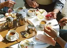 Britons also hold opinions as to the proper manner in which to drink tea when using a cup and saucer.[81] Historically, during the 1770s and 1780s, it was fashionable to drink tea from saucers. Saucers were deeper than is the current fashion, and therefore more similar to bowls like their Chinese antecedents.[82] If one is seated at a table, the proper manner to drink tea is to raise the teacup only, placing it back into the saucer in between sips. When standing or sitting in a chair without a table, one holds the tea saucer with the off-hand and the teacup in the dominant hand. When not in use, the teacup is placed back in the tea saucer and held in one's lap or at waist height. In either event, the teacup should never be held or waved in the air. Fingers should be curled inwards; despite popular belief in the United States, no finger should extend away from the handle of the cup.[72]