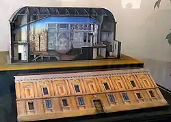 In the 17th century, Scamozzi's original scenery was removed and replaced by a new system with sliding wings.[3] However, his original plans—which are shown above—were preserved in the archives at the Uffizi in Florence, making it possible, in the twentieth century, for new scenery to be rebuilt based on the original plans and added to the theatre.