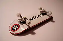 A fingerboard is a working replica (about 1:8 scaled) of a skateboard that a person "rides" with their fingers, rather than their feet. The device itself is a scaled-down skateboard with graphics, trucks and plastic or ball bearing wheels, just like a skateboard.[1] A fingerboard is typically 100 millimeters (3.9 in) long with width ranging from 26 to 55 mm (1.0 to 2.2 in). A fingerboard can be used to do traditional skateboard tricks, such as an ollie, kickflip, and more.