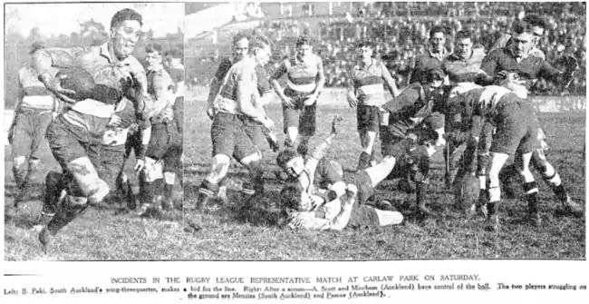 Against City on 27 July he "played a very fine game at centre and made some nice runs through the defence" and was subsequently selected for the Auckland team to play Taranaki by Bert Avery, Ernie Asher, and his father Bill (William) with the three selectors having retained their role.[66] The Herald was glowing in their praise of Mincham comparing his play to his opposite Lou Brown who had played professionally for several years in England but was back in New Zealand playing for City Rovers. They said "the splendid football of L. Brown and E. Mincham, the rival centre three-quarters, was a feature of the big game, and the pair made a favourable impression with the crowd. It is a long time since the code has possessed two such clever players on attack. Brown has had much more experience than Mincham, but the last-named is almost as brilliant. With a few games together in representative matches the pair are likely to provide an obstacle for the visiting Australian team".[67] Against Taranaki he scored 3 tries in a 37–14 win at Carlaw Park and was said to be "the scintillating start of the Auckland backs, his speed, sure handling and team work with his centre, Lou Brown, bringing a rich harvest of tries for his side".[68]