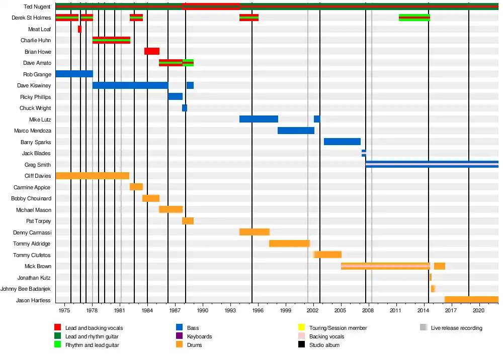 Theodore Anthony Nugent (/ˈnuːdʒɪnt/; born December 13, 1948) is an American singer, songwriter, guitarist and activist. He initially gained fame as the lead guitarist and occasional lead vocalist of The Amboy Dukes, a band formed in 1963 that played psychedelic rock[2][3] and hard rock.[4][5] After dissolving the band, he embarked on a solo career. Nugent is known for his Gibson Byrdland, his bluesy and frenzied guitar playing and his energetic live shows.[6] Despite possessing a distinctive, wide-ranging singing voice, Nugent recorded and toured with other lead singers during much of his early solo career, including Derek St. Holmes, Charlie Huhn, Brian Howe and Meat Loaf, only taking on full lead vocal duties later on.[7] His biggest hit was 1977's "Cat Scratch Fever," on which he sang the lead vocals. In the late 1980s and early 1990s, he was part of the supergroup Damn Yankees.