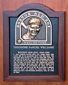 Williams retired from playing in 1960. He was inducted into the Baseball Hall of Fame on July 25th of 1966, in his first year of eligibility.[2] Williams managed the Washington Senators/Texas Rangers franchise from 1969 to 1972. An avid sport fisherman, he hosted a television program about fishing, and was inducted into the IGFA Fishing Hall of Fame.[3] Williams's involvement in the Jimmy Fund helped raise millions in dollars for cancer care and research. In 1991, President George H. W. Bush presented Williams with the Presidential Medal of Freedom, the highest civilian award bestowed by the United States government. He was selected for the Major League Baseball All-Time Team in 1997 and the Major League Baseball All-Century Team in 1999.
